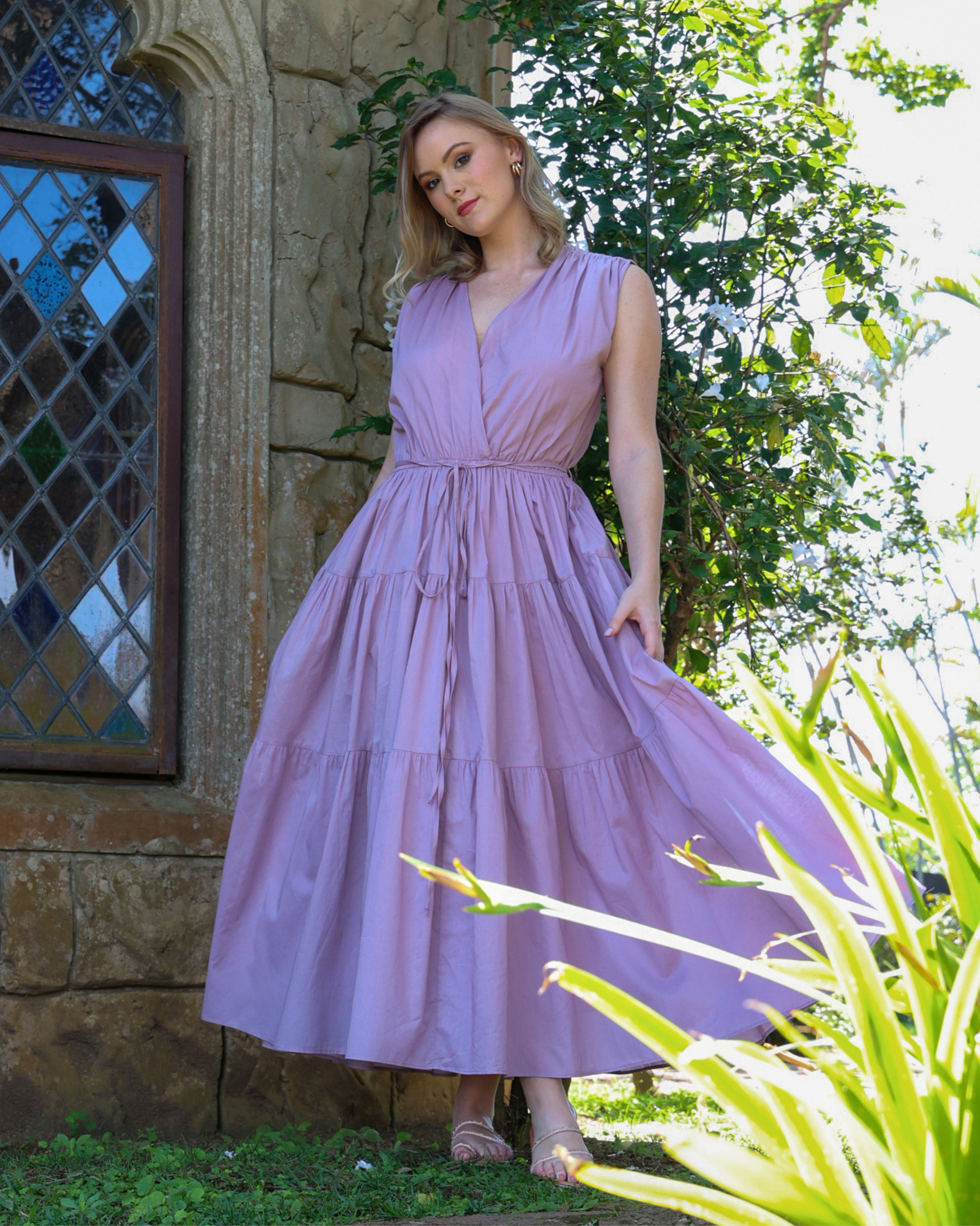 Strappy Mauve Reverie Pleated Bodice Cotton Maxi Dress